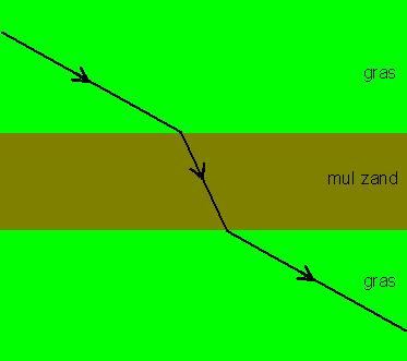 voorbeeldsituatie. De lichtstraal verplaatst zich naar een stof waarin de